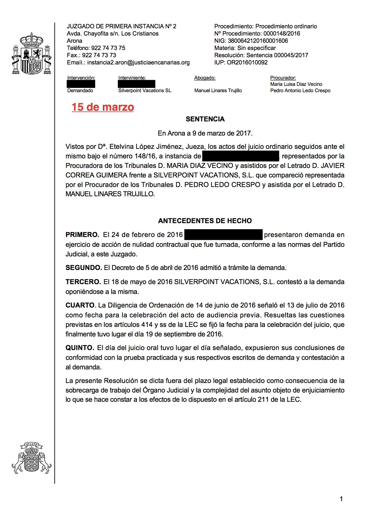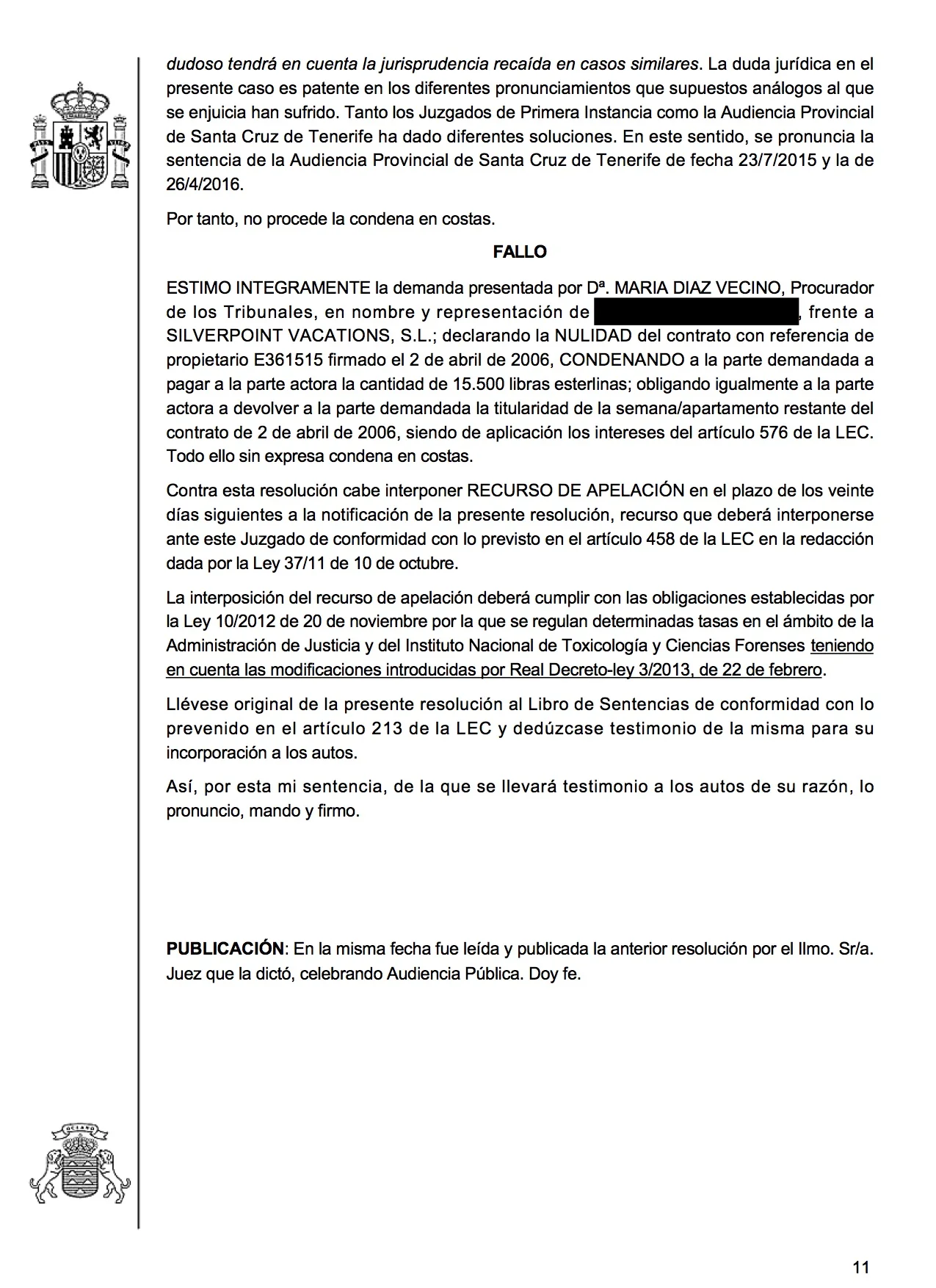 Your lordship, Dña. Etelvina López Jiménez, declared the contract signed between my client and Silverpoint null and void because there were no reference to its termination date and the object had not been described as article 9.1.3 of Law 42/98 requires. The client is considered a consumer and is granted the return of all the money paid for the signing of the contract as well as the amounts received on the same day of signing. Surprisingly is not awarded legal costs. This concrete legal aspect will be appealed in due course.